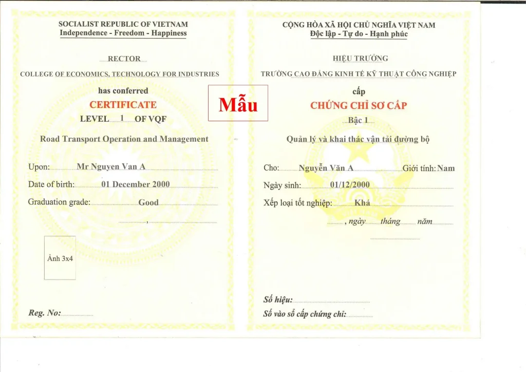 - Chứng chỉ: sau khi hoàn thành khóa học, những học viên đạt yêu cầu được cấp chứng chỉ sơ cấp Quản lý và khai thác vận tải đường bộ theo quy định của Bộ Lao động Thương binh và Xã hội. Chứng chỉ sơ cấp Điều hành vận tải, Chứng chỉ sơ cấp Quản trị và khai thác vận tải đường bộ, Là điều kiện cần và đủ để hành nghề kinh doanh vận tải theo quy định.