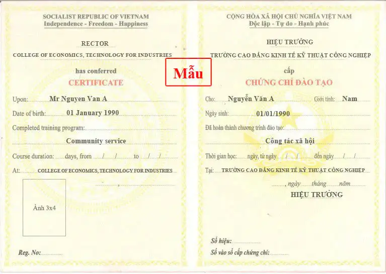 - Chứng chỉ nhận được: “Chứng Chỉ Sơ Cấp Nghề Công Tác Xã Hội”.